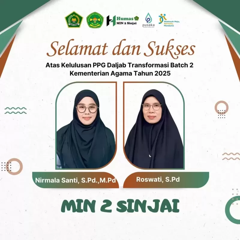 Lappa, Sinjai Utara (MIN 2) - Kabar membanggakan datang dari Madrasah Ibtidaiyah Negeri (MIN) 2 Sinjai. Dua orang pendidik madrasah tersebut, Nirmala Santi dan Roswati, berhasil lulus dalam Program Pendidikan Profesi Guru (PPG) Transformasi Dalam Jabatan (Daljab) Batch 2 Tahun 2025 yang diselenggarakan oleh Kementerian Agama Republik Indonesia, Selasa (21/10/2025)
